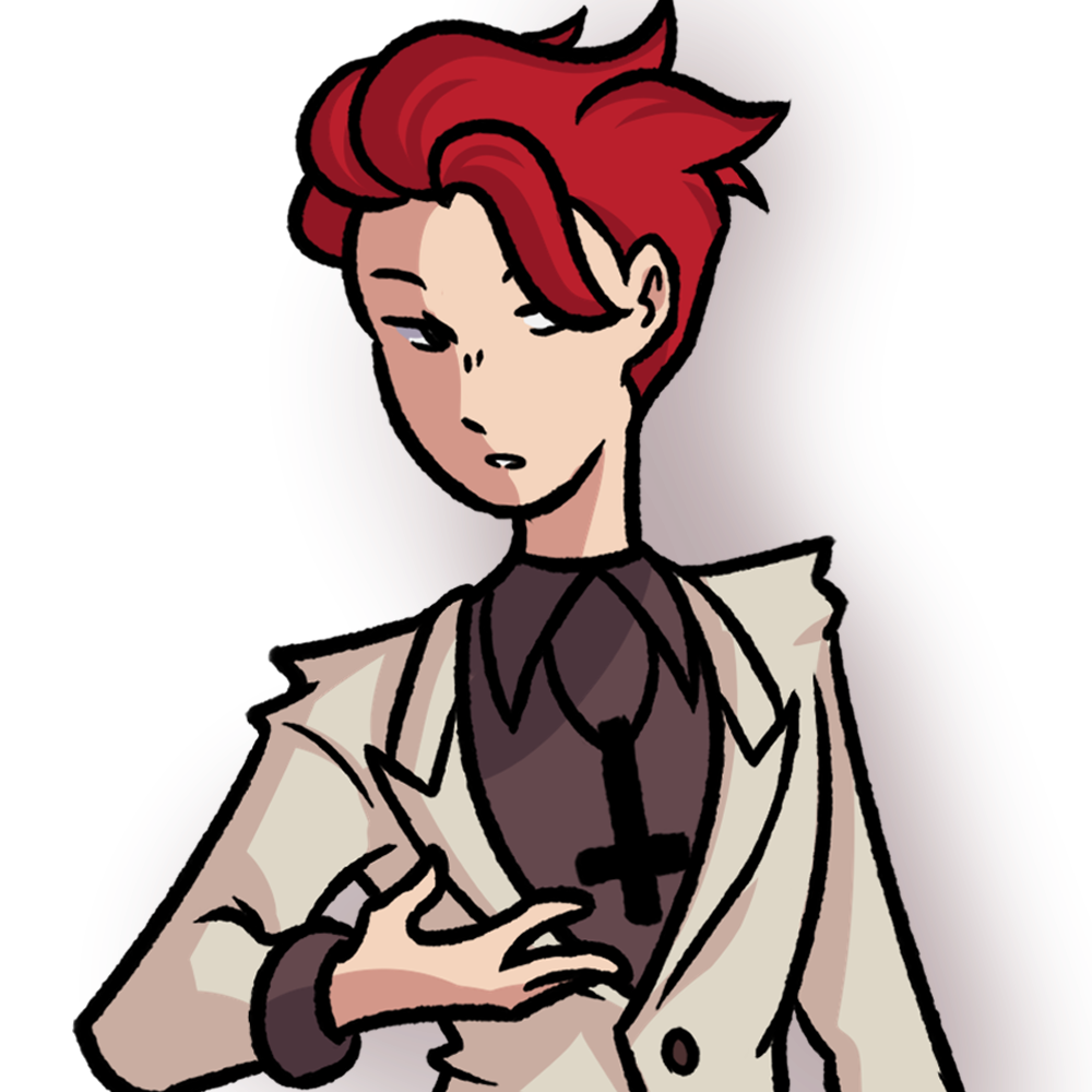 Abel received quite a few changes compared to the other characters. His hair, jacket, and shoes were all redesigned. The buttoned jacket helps him feel more formal and tidy, while also contributing to a sharper shape language. I also simplified his hair to the same color that Cain's is, and enlarged the cross necklace.